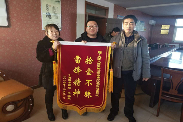 12月19日早晨,王淑榮女士帶著村支部書記和全家來到唐山分公司,為鄭福齋送上一面“雷鋒精神,拾金不昧”金光閃耀的錦旗,并感謝單位培育了一名好員工。